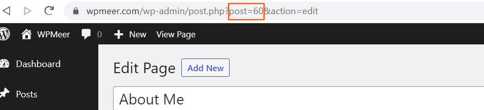 Firstly, you will need to find this identifier. The easiest way is to use the WordPress dashboard. Go the Pages section, find the page you wish to target and tap on it to edit it. Once in the Edit window take a look at the URL. The WPMeer “about Me” page in Edit mode shows the following URL