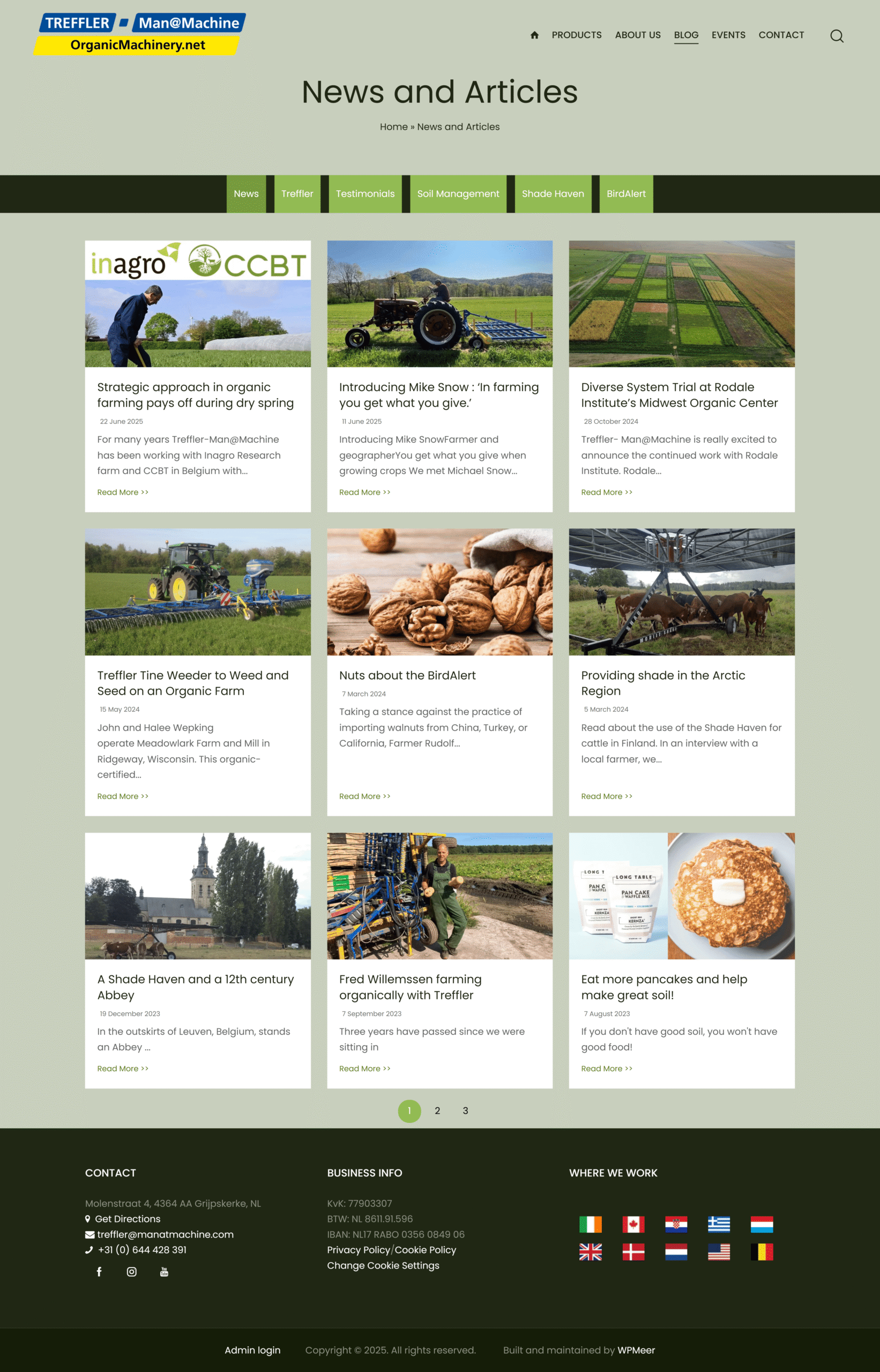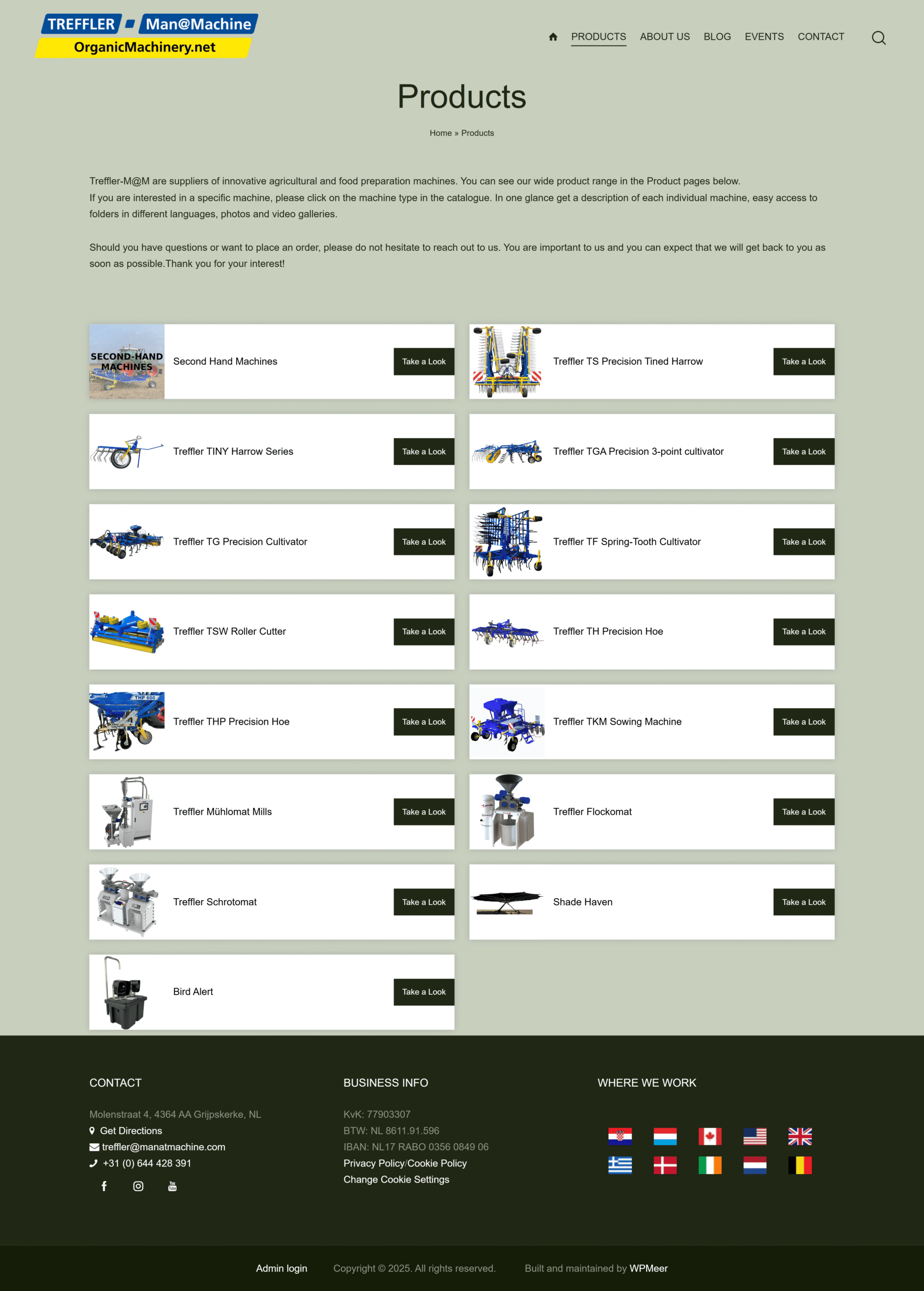 This site uses a heavily customised theme from Axio Themes and incorporates an event calendar (Modern Event Calendar), photo & video galleries, a blog, product tables and WooCommerce webshop for viewing and registering interest in their farm machinery. The product pages make use of